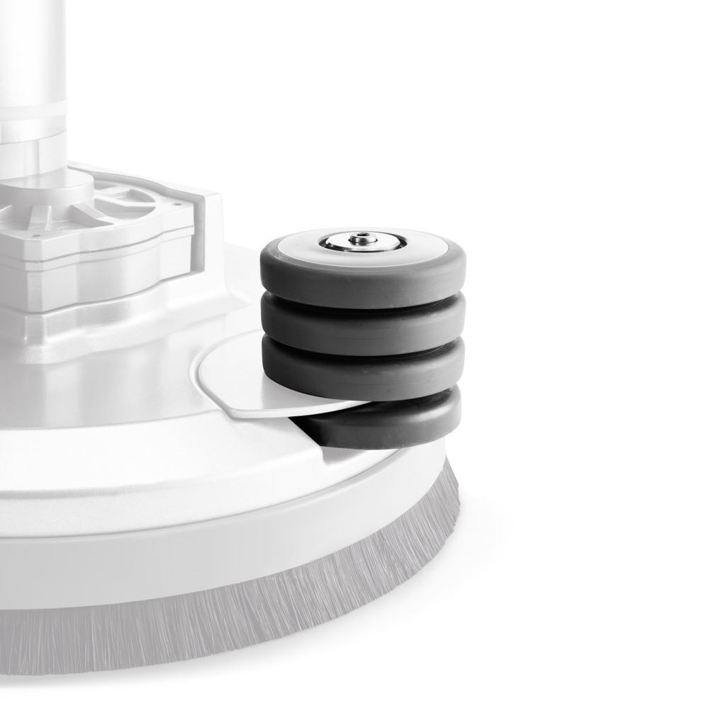 Ce kit est notamment destiné aux domaines d'utilisation suivants : passages étroits, nettoyage au plus près des bords le long des murs, zones comportant beaucoup d'obstacles tels que les palettes, les rayonnages dans les supermarchés, etc. Ces zones impliquent un risque d'accrochage. Cela peut entraîner des dégâts sur la machine et les objets d'aménagement. Des roulettes de protection plus hautes/superposées permettent de prévenir ce risque. De série, une roulette de protection est fixée sur le côté droit de la tête de brossage à disques. Le kit permet de fixer sur cette roulette de protection de série des roulettes de protection supplémentaires, d'où la mention « superposée ». Jusqu'à 3 roulettes de protection supplémentaires peuvent être fixées, la hauteur étant ainsi entièrement personnalisable. Un avantage considérable : les roulettes de protection protègent notamment les aménagements et les murs contre les éraflures, les dégâts et les traces que la tête de brossage risque de causer en cas de contact.