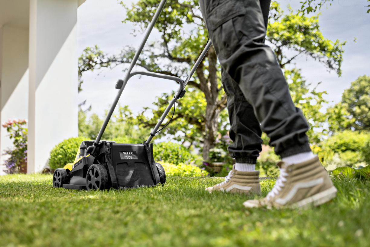 Alimentée par 2 batteries de 18 V pour un puissant moteur de 36 V et une largeur de coupe de 37 cm – l'idéal pour les pelouses jusqu'à 450 m².