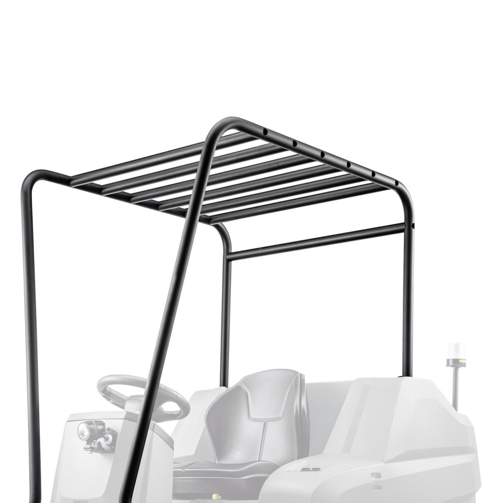 Idéal pour la sécurité préventive en cas de chute d'objets pendant le nettoyage dans les entrepôts à rayonnages hauts : le toit de protection robuste pour la balayeuse aspirante KM 100/120 R de Kärcher.