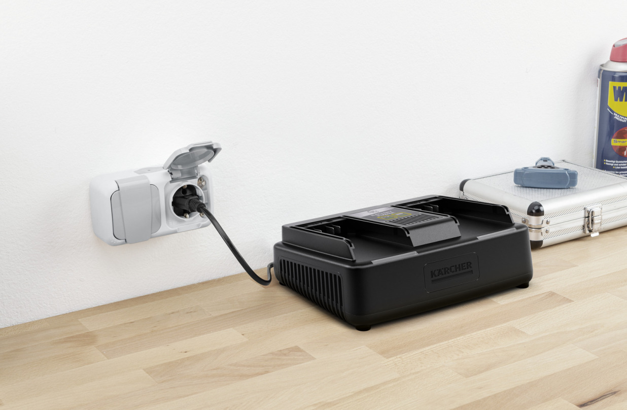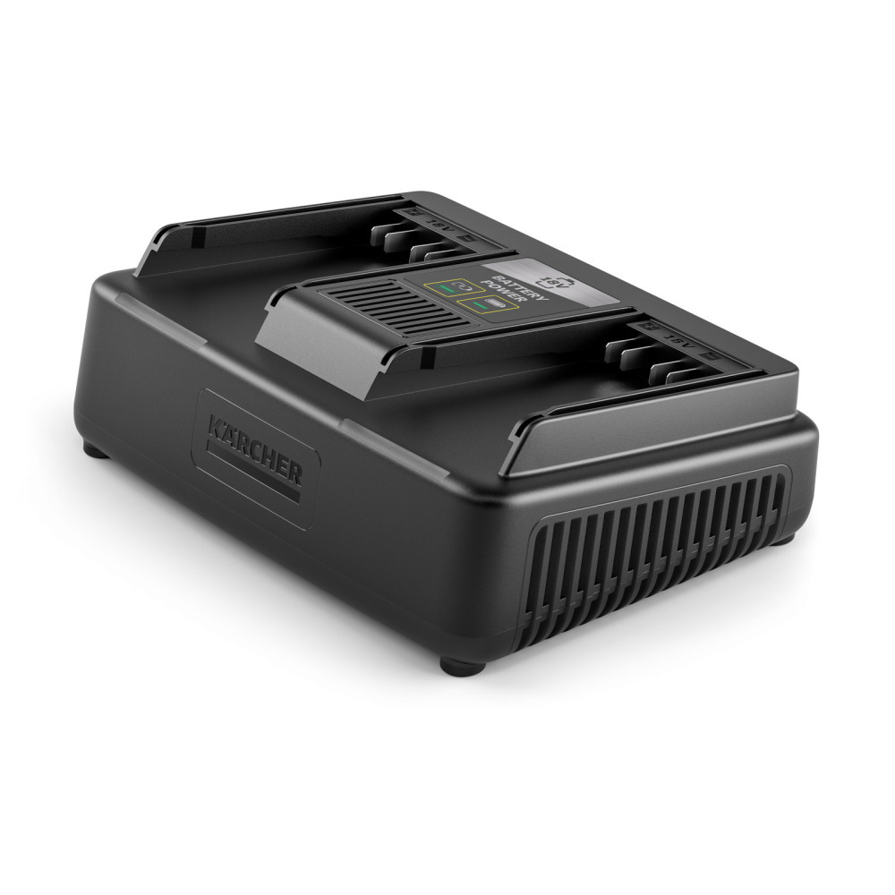 De dual fast charger kan dankzij twee laadsloten gelijktijdig twee accu’s opladen. Met de ingebouwde wandbeugel is hij eenvoudig aan de muur te bevestigen. De snellader laadt 18 V/2,5 Ah Kärcher Battery Power verwisselbare accu’s in slechts 44 minuten tot 80% op. Daarnaast is hij geschikt voor het opladen van alle andere 18 V verwisselbare accu’s binnen het Kärcher 18 V batterijplatform.