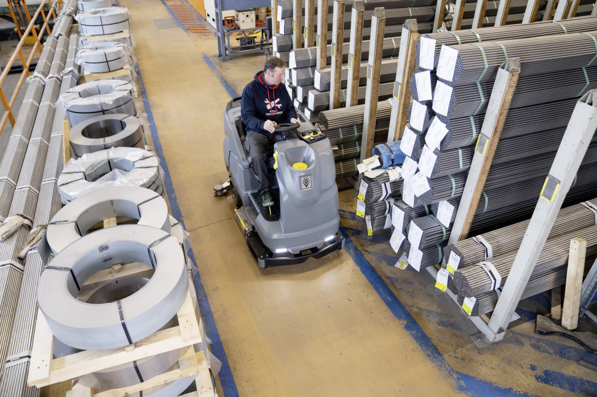 Accu-aangedreven B 220 R + R 85 opzit-schrobzuigmachine. Met een 220-liter tank, efficiënte rolborsteltechniek, 85 cm werkbreedte en het FACT-systeem voor regulering van de borstelsnelheid.