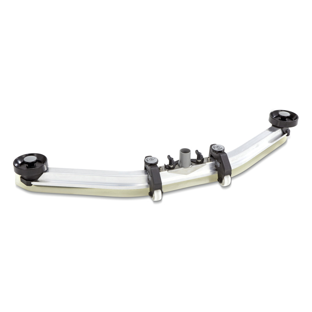 Speciale haaks gebogen zuigbalk met bijzonder groot zwaaibereik. Zuigstrips van oliebestendig, transparant polyurethaan met een bijzonder lange levensduur. Met steunwieltjes.