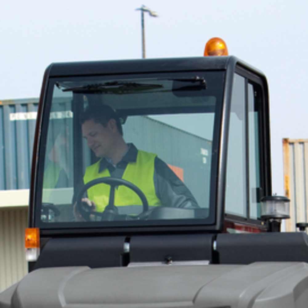 De stevige stalen constructie biedt de bestuurder een betrouwbare bescherming. Volledig beglaasd met scharnierende achterruit en linker zijruit.