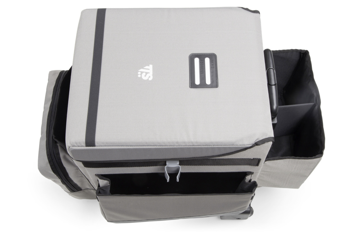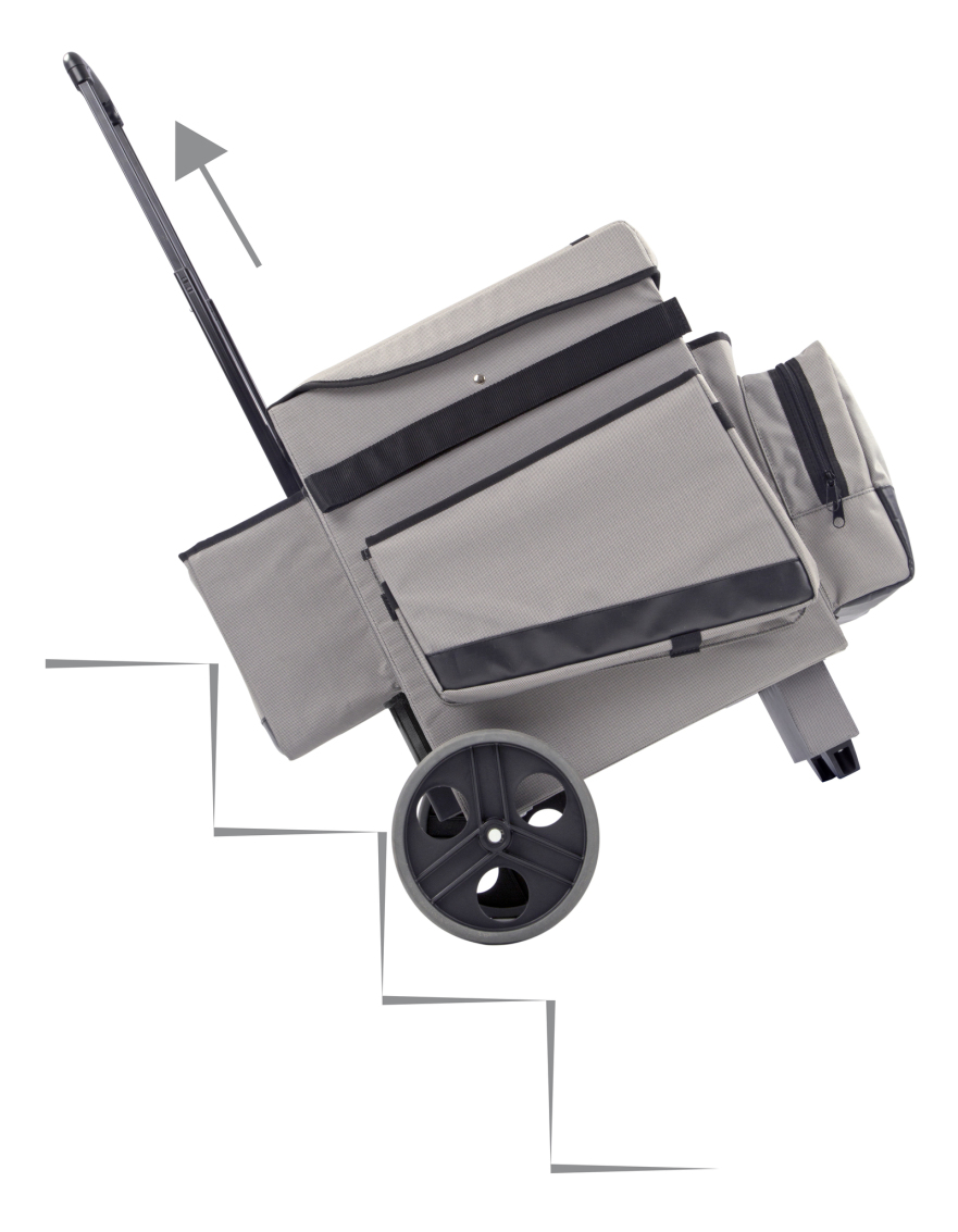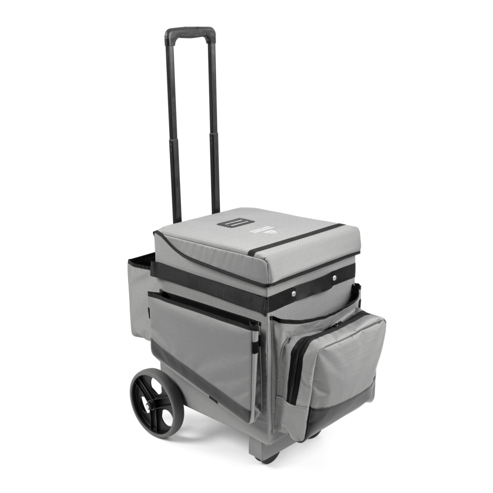 Servicewagen met axiale wielen, uitgerust met verplaatsbaar dienblad, multifunctionele vakken, haak- en riemband om gereedschap aan te bevestigen en verstelbare indeling.