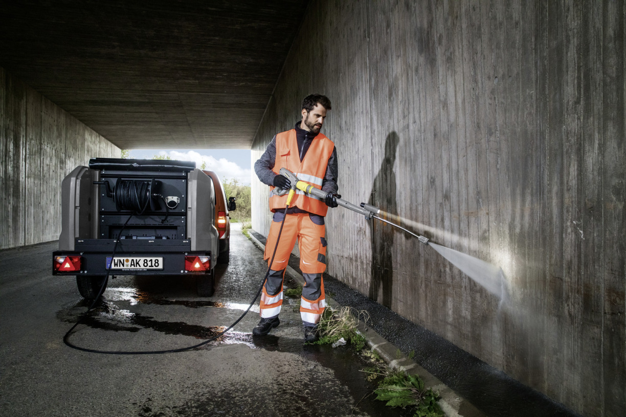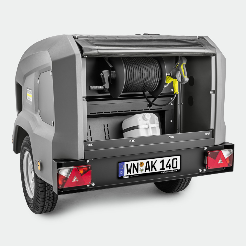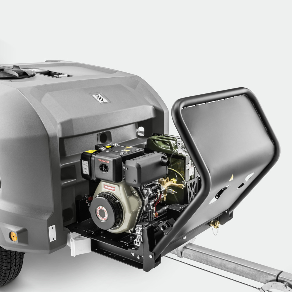 Onze mobiele koudwatertrailer HD 9/23 De Tr1 is uitgerust met een supersterke, betrouwbare en milieuvriendelijke (EU STAGE V) Yanmar-dieselmotor en een watertank met een inhoud van 1000 liter. De trailer werkt daarmee volledig onafhankelijk. Langdurige reinigingswerkzaamheden met hoge druk, die bijvoorbeeld vaak voorkomen bij gemeentereiniging of op bouwplaatsen, worden hiermee probleemloos uitgevoerd. Met een werkdruk van 230 bar en een doorstroomcapaciteit tot 930 liter per uur kan hij bijna alles aan. De HD-trailer is standaard voorzien van een ergonomisch EASY!Force-hogedrukpistool en een groot aantal opbergmogelijkheden. Het robuuste apparaat is bovendien eenvoudig te bedienen. Optioneel is het in meerdere configuraties leverbaar - bijvoorbeeld met een slanghaspel aan de achterkant, of in een cab-versie.