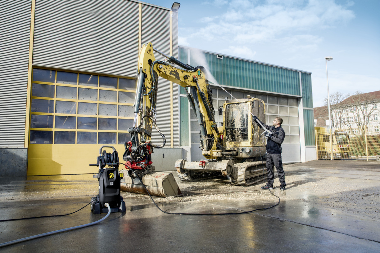 De HD 7/16 MX Plus + FR Classic Anniversary Edition in het zwart met manuele slanghaspel, vuilfrees en terrasreiniger met 4-polige, langzaam lopende driefasenmotor overtuigt als servicevriendelijke apparaat. De nieuw ontwikkelde, robuuste 3-zuiger axiaalpomp met messing cilinderkop verhoogt de reinigingsprestaties en energie-efficiëntie met een indrukwekkende 20 procent en garandeert tegelijkertijd een lange levensduur. De automatische drukverlaging en een groot waterfilter nemen de bescherming van de hoogwaardige componenten voor hun rekening. Innovatieve oplossingen zorgen voor moeiteloos werken en tijdbesparende op- en afbouw: Terwijl het EASY!Force hogedrukpistool gebruik maakt van de terugslagkracht van de hogedrukstraal om de houdkracht tot nul te reduceren, maken de EASY!Lock snelkoppelingen een tot 5 keer snellere hantering mogelijk in vergelijking met conventionele schroefverbindingen zonder negatieve gevolgen voor de robuustheid en duurzaamheid. Dankzij slimme oplossingen is er direct op het apparaat passende ruimte voor accessoires, waaronder de optionele schuimlans met beker.