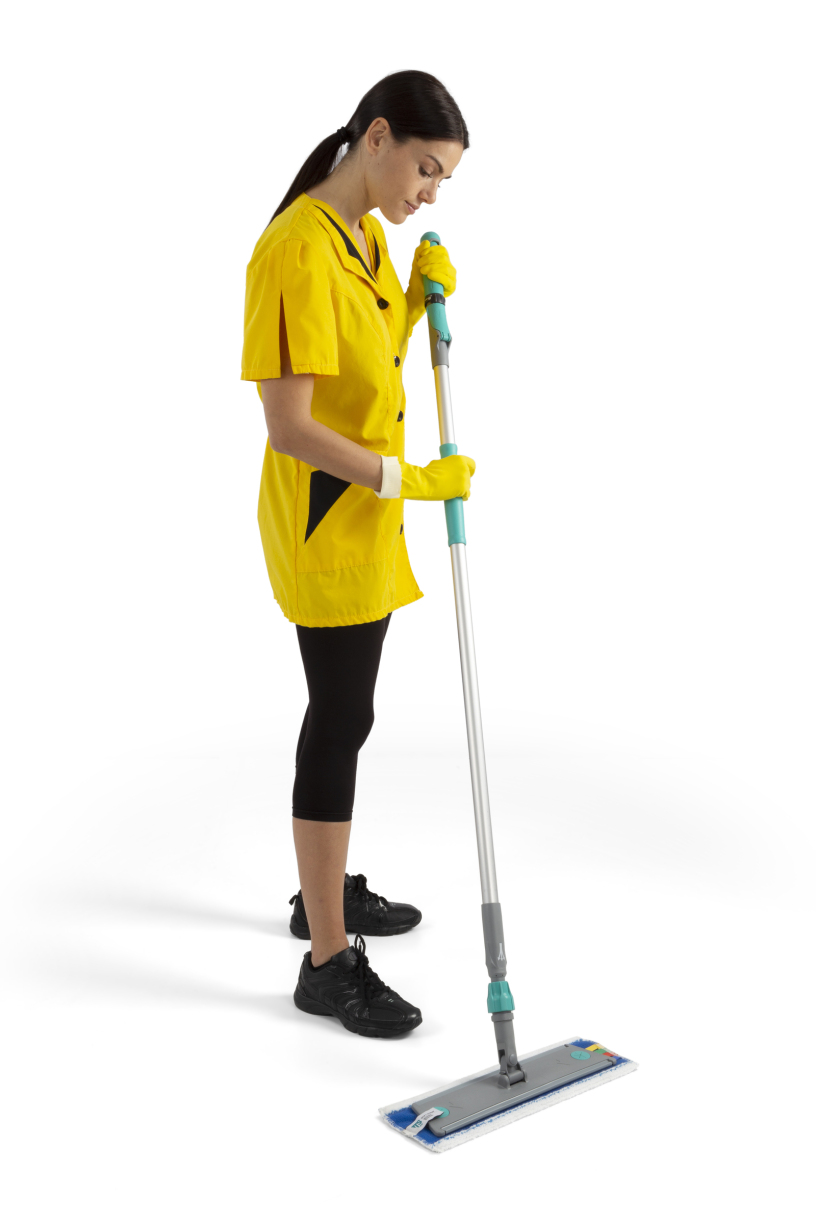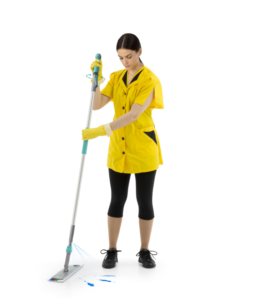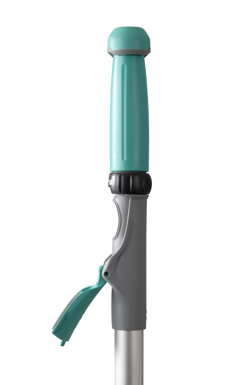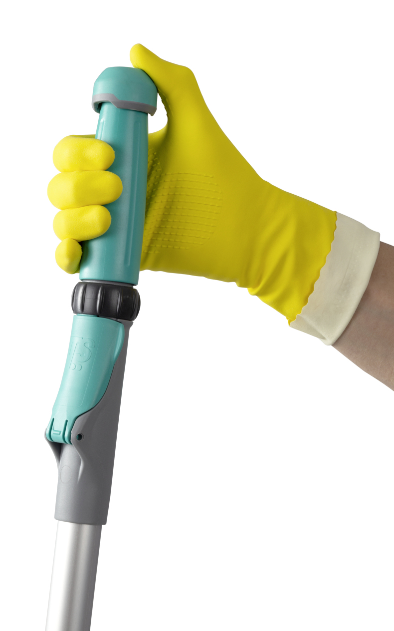 Handvat met tank voor schoonmaken zonder emmer, met frame voor klittebandsysteem. Ideaal voor moeilijk bereikbare omgevingen zoals trappenhuizen en een nauwkeurige reiniging van onverwacht vuil of in combinatie met reiniging met apparatuur.