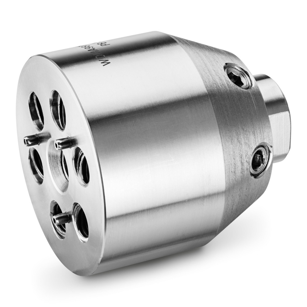 6-straals sproeierdragerkop voor F21-sproeier. Geschikt voor werkdruk tot 3.000 bar. 25° sproeihoek, incl. beschermkap en stromingsrichter.